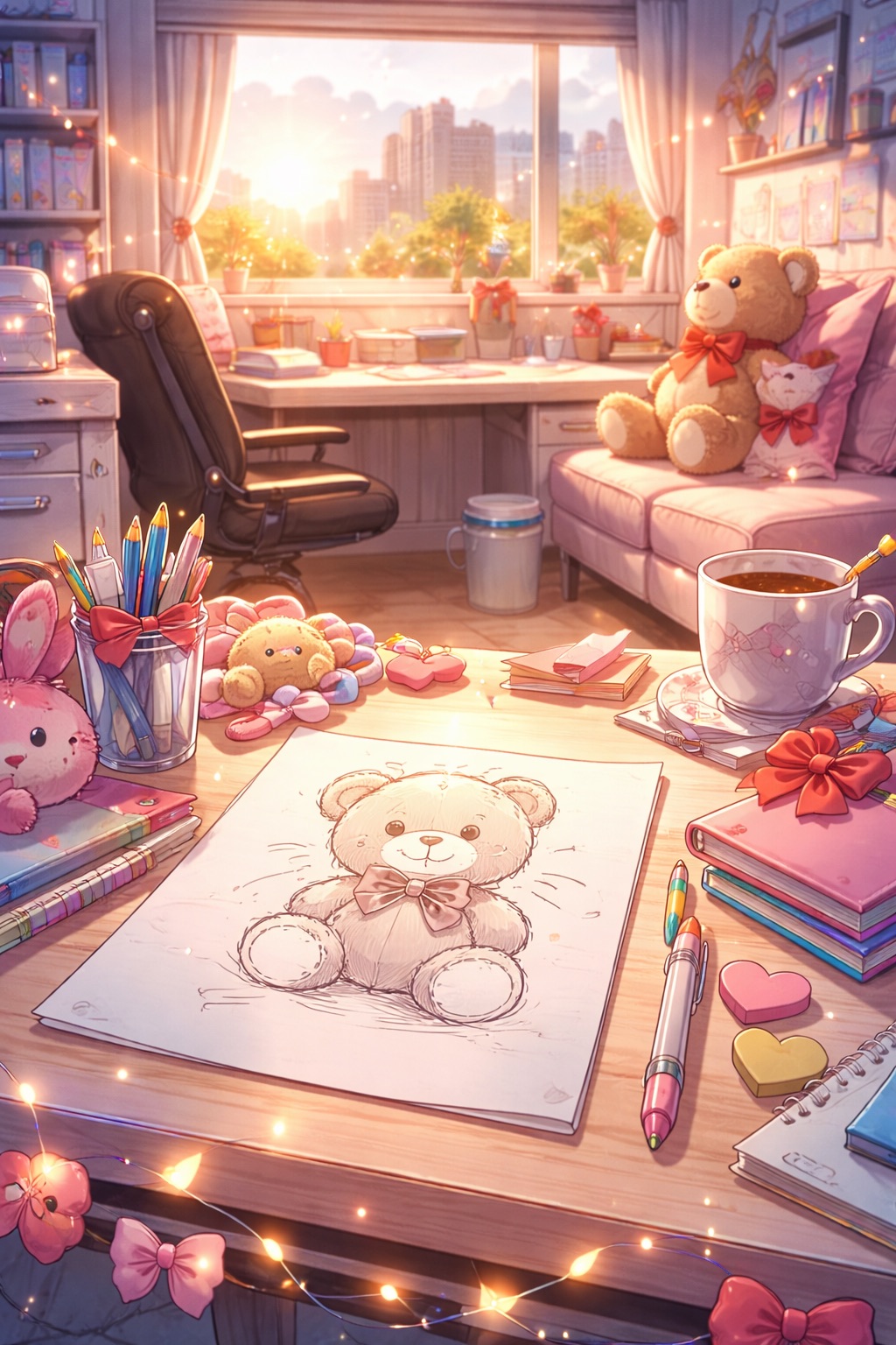 (早朝。編集室。えむくんが窓側に立っている)